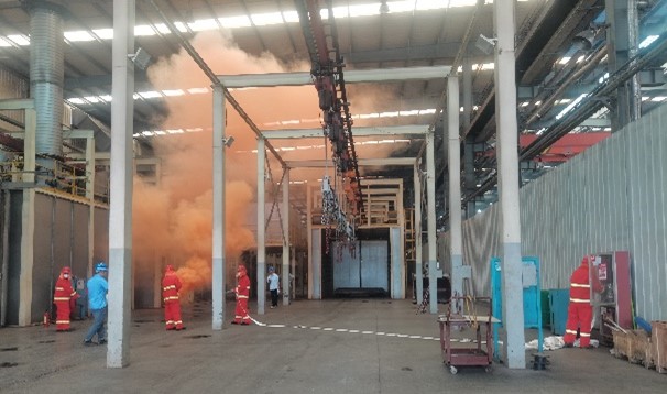 陕西西部重工有限公司演练模拟1号涂装线喷漆房内因作业过程油漆含量过高,工人使用铁器敲击产生火花,引燃油漆及辅料,员工呼救,现场指挥部依据应急预案,第一时间启动应急预案,进行灭火和救援,组织危险区域人员疏散。演练过程按规范要求操作、有序、安全。